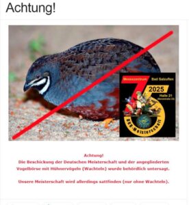 Achtung!!! Die Einlieferung der Vögel ist am FREITAG, den 15. November!!!