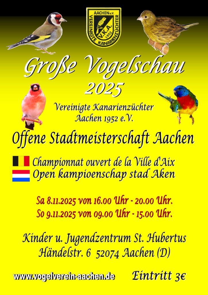 Die Vereinigten Kanarienzüchter Aachen e.V. zeigen Ihre zukünftigen Aktivitäten im Veranstaltungskalender des Landesverbandes und auf der Seite der Aktivitäten im Raum Aachen. Vielleicht möchten Sie uns bei unserem monatlichen Vereinstreffen besuchen oder an einer unserer anderen Veranstaltungen teilnehmen.
