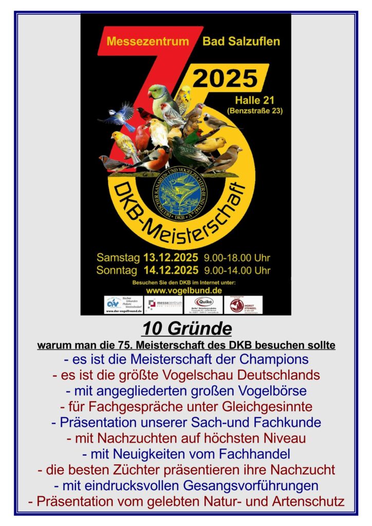 Deshalb veranstaltet der DKB die Deutsche Meisterschaft, welche jährlich nach den Vereins- und den Landesmeisterschaften stattfindet. Dieses Treffen ist eine Notwendigkeit in der organisierten Vogelzucht.